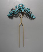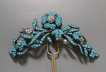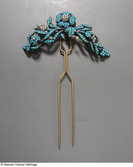 Türkiscabochons in Pavé-Fassung, Perlen und Halbperlen, sechs rosa Rubine. Fassung Silber, vergoldet, zwei Befestigungsnadeln, die durch ein Scharnier mit dem Diadem verbunden sind. |