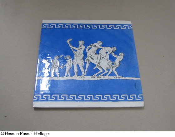 Steingut, heller weißlicher Scherben, schwarzer Druckdekor, Grund blau, von Hand glasiert. |