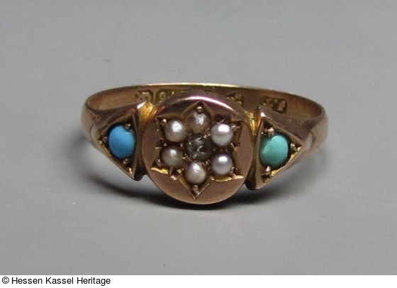 Goldener Ring mit Türkisen, Halbperlen und einem Diamanten
