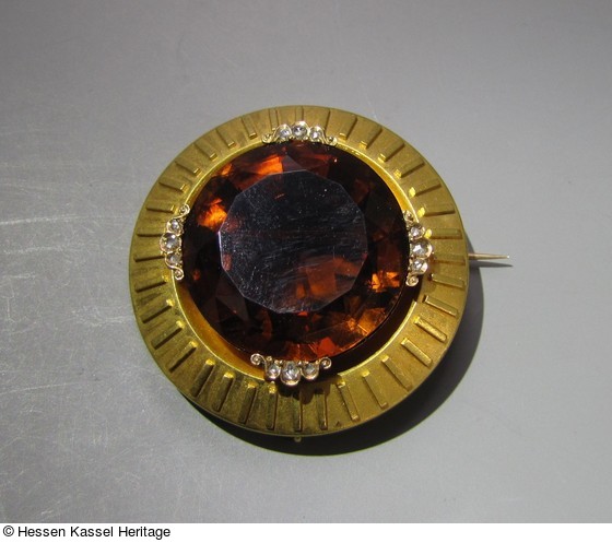 Goldene, diamantenverzierte, runde Brosche mit einem großen Citrin