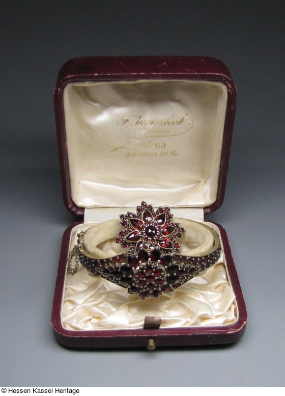 Granatschmuck, silbervergoldet, bestehend aus Armreif und sternförmiger Brosche in originalem Etui