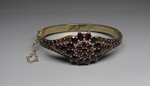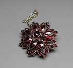 Granatschmuck, silbervergoldet, bestehend aus Armreif und sternförmiger Brosche in originalem Etui |