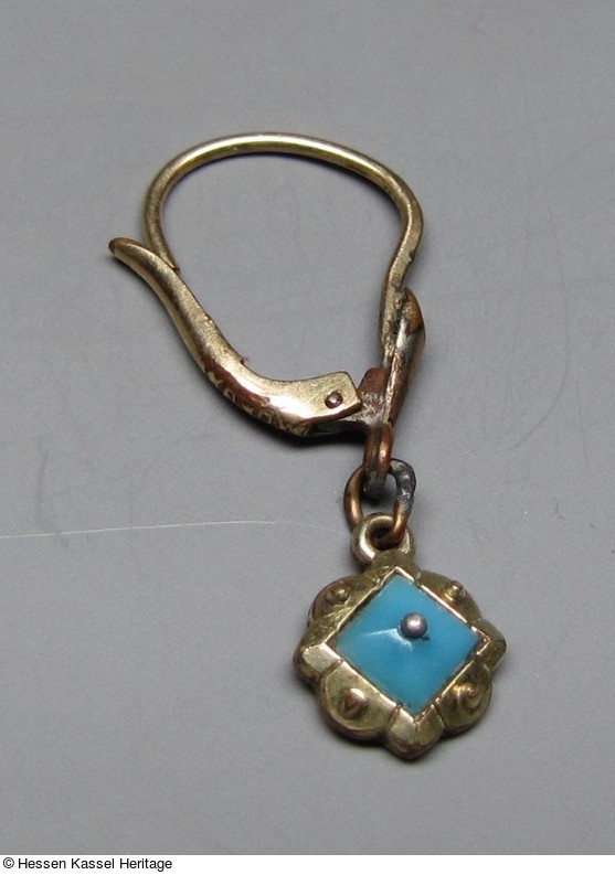 Ohrring aus Gold mit einem türkisfarbenem Glasstein |
