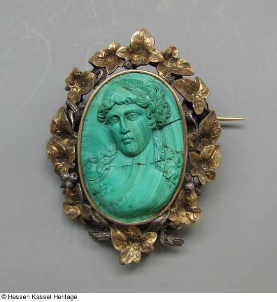 Silber, getrieben, graviert, punziert, Vorderseiten der Weinblätter vergoldet. Malachit. |