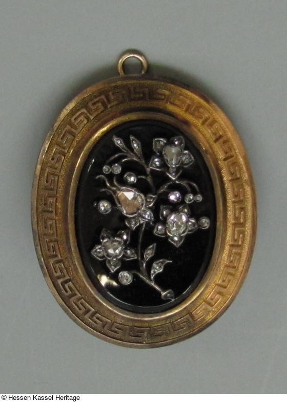 Goldene Medaillonbrosche (Trauerschmuck) mit Blütenzweig in Mäanderrahmen |