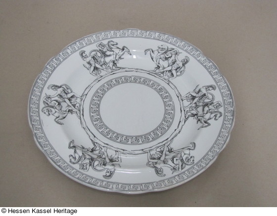 Steingutteller mit Kampfszenen zwischen berittenen Amazonen und Griechen in schwarzem Druckdekor |