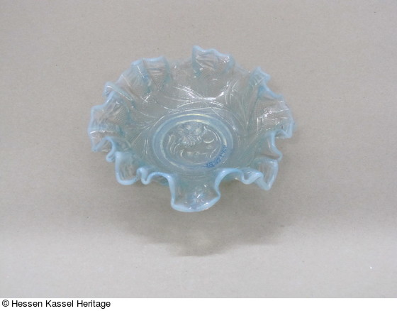 Durchsichtiges, bläuliches Glas, am Rande opak anlaufend, stempelgepreßt, Fahne noch im heißen Zustand mehrfach gefaltet.