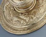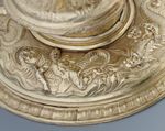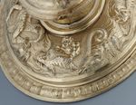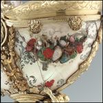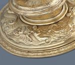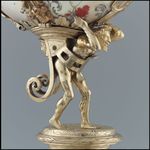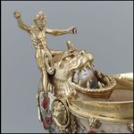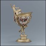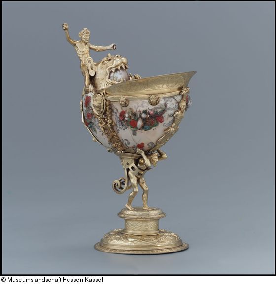 Silber, gegossen, getrieben, graviert, geätzt, punziert, vergoldet; Nautilus, geschält, mit polierter Perlmuttschicht, Wirbelfrontfreischnitt im oberen Viertel, silbergraue Bemalung, applizierte Schnecken, Muscheln, plastische Wachsblüten, weiß, rot und grün bemalt, blaue und grüne Glaspasten- und -flüsse |