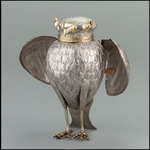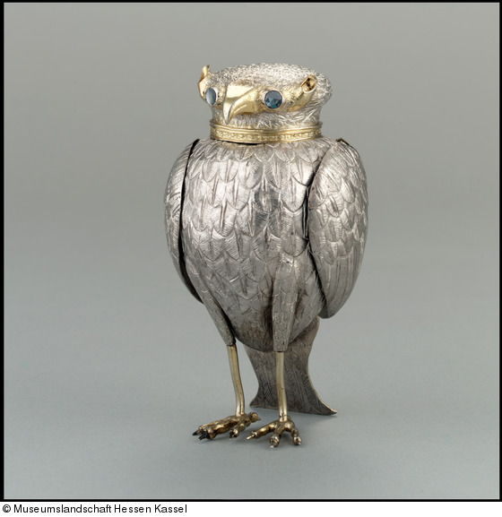 Trinkgefäße in Eulenform waren seit der Mitte des 16. Jhs. sehr beliebt und haben sich in zahlreichen Ausführungen erhalten. Die kostbaren, aus silber gefertigten Trinkgefäße zierten die höfische Tafel oder das Buffet.