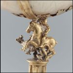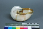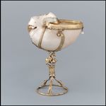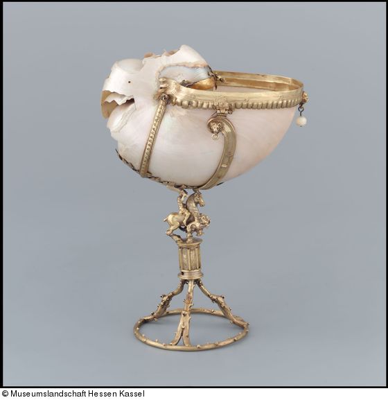 Silber, gegossen, getrieben, graviert, vergoldet; Nautilus mit polierter Perlmuttschicht; eine Perle; ein kleiner blauer Glasstein |