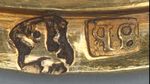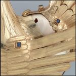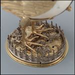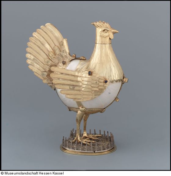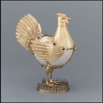 Silber, gegossen, getrieben, graviert, punziert, vergoldet; Nautilus mit polierter Perlmutterschicht; Glassteine, durchsichtig und in den Farben Blau, Grün |