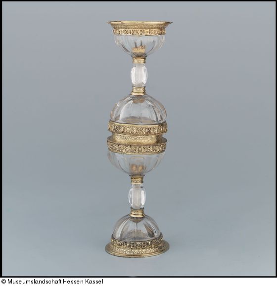 Bergkristall ist ein Quarz, der in der Frühen Neuzeit durch Schleifen und Schneiden bearbeitet wurde. Der massiver Kristall musste zunächst ausgehöhlt werden, ehe er durch Hoch- und Tiefschnitt zu hauchdünnen, filigran verzierten Gefäßen veredelt werden konnte.