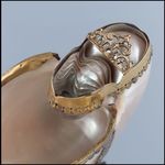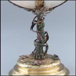 Silber, gegossen, getrieben, graviert, punziert, gesägt, vergoldet; Kaltbemalung in den Farben Rot, Grün, Braun, Blau und Weiß; Nautilus mit polierter Perlmutterschicht und Wirbelfrontfreischnitt