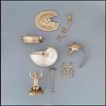 Material / Technik: Silber, gegossen, getrieben, graviert, punziert, ziseliert, geätzt, vergoldet; Nautilus mit polierter Perlmutterschicht und Flachreliefschnitzerei