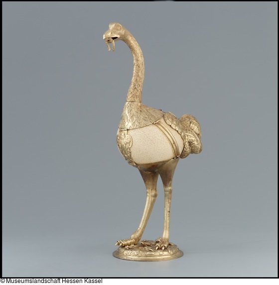 Naturnah gestaltete Tierplastiken mit abnehmbaren Köpfen erfreuten sich um 1600 besonderer Beliebtheit. Die kostbaren, aus Silber und aus fernen Weltgegenden stammenden Materialien, wie z.B. Straußenei, gefertigten Trinkgefäße zierten die höfische Tafel und das Buffet.