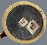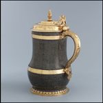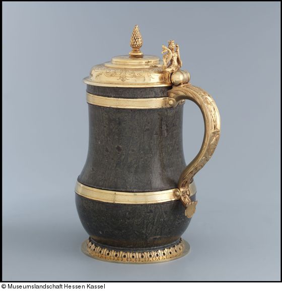 Silber, gegossen, getrieben, graviert, punziert, vergoldet; graugrüner, schwarz geäderter Granatserpentin (Zöblitzer Serpentinit mit in Umwandlung (sog. Kelyphitisierung) befindlichem Granat (Pyrop)), gedreht, poliert |