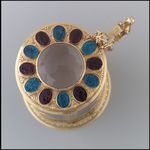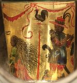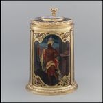 Silber, gegossen, getrieben, graviert, punziert, vergoldet; Glas, hintermalt, ameliert; aufgeklebte Zinnfolien; "trügerische Hinterglasmalerei" mit bemaltem, aufgeklebtem Pergament; Kristallglas, geschliffen; gefärbte Glaspaste; rote Wachsmasse (zur Abdichtung und Verkittung der einzelnen Glassegmente) |