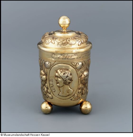 Silber, getrieben, graviert, punziert, ziseliert, gelötet, vergoldet |