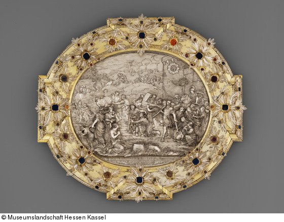 Relief 29,4 x 36,5 x 2 cm (Objektmaß) mit Rahmen und Besatz 45,8 cm (Höhe) mit Rahmen und Besatz 52,4 cm (Breite) Relief 841,8 g (Gewicht) Rahmen 1670 g (Gewicht)