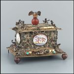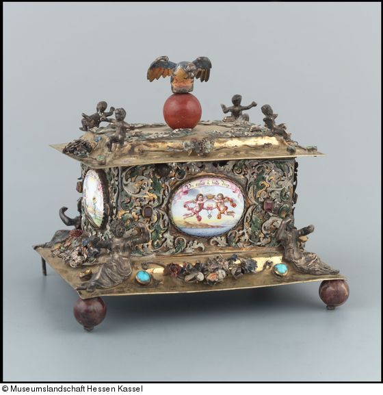 Silber, getrieben, gegossen, gesägt, vergoldet; Katlbemalung in Ölfarbe; roter Achat, vier türkisfarbene Glaspasten; drei Flußperlen; acht rote, drei goldfarbene und fünf grüne Glassteine; Emailmalerei auf Kupfer (?) |