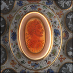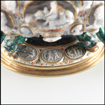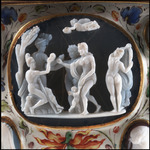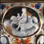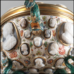Der Kameenbesatz folgte ursprünglich möglicherweise einem ikonographischen Programm, wurde durch spätere Veränderungen aber verunklärt. Auf dem Deckel umrahmen zwei Reihen eine zentrale Kamee mit der Darstellung des römischen Kaisers Caracalla (188–217). Der äußere Ring gibt die zwölf Tierkreiszeichen in Gestalt antiker Planetengötter wieder, der innere stellt Begebenheiten der römischen Geschichte dar. Auf der Wandung fallen die zentralen Kameen mit dem „Parisurteil“ und den „Kentauren und Lapithen“ (oder „Nessus raubt Deijaneira“?) ins Auge, die von Porträtkameen umrahmt werden. Im Zentrum des Fußes sitzt der größte Stein, vermutlich ein byzantinischer Onyx mit Darstellung eines Elefanten, auf dessen Schultern ein Treiber sitzt. Gerahmt wird dieser von zehn Muschelschnitten mit biblischen und mythologischen Themen. Trotz späterer Veränderungen, die eine Deutung erschweren, lässt sich das Programm als eine Tugend- und Herrschaftsallegorie lesen.