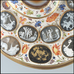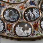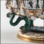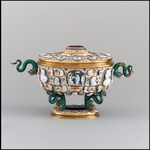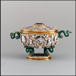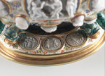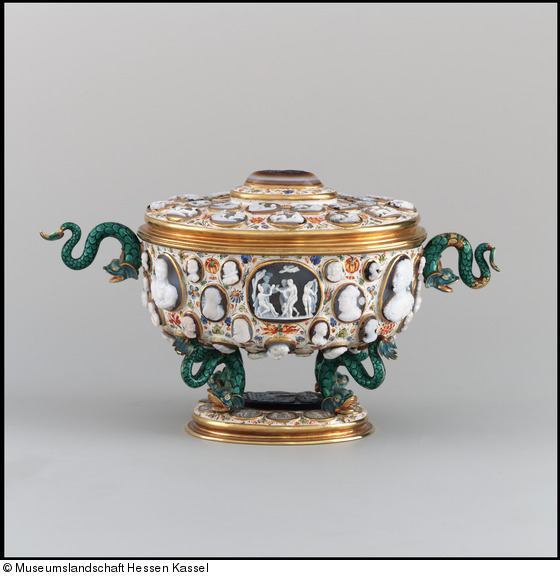Die elegante Deckelschale zählt zu den wertvollsten und gleichzeitig rätselhaftesten Meisterwerken der Kasseler Sammlung. Ihr Gefäßkörper aus Gold ist mit opakem weißem Email überzogen, auf das in größter Virtuosität Tulpen sowie weitere Blüten und Blätter gemalt sind. 96 Kameen und Muschelschnitte zieren die Oberfläche. Vier Delphine mit transluzidem grünem Email heben den Schalenkörper empor, zwei weitere bilden ihre Handhaben.