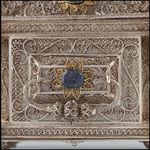 Silberfiligran, Silber, getrieben, teilvergoldet; verschiedenfarbige Glassteine, teilweise mit Resten von Bemalung |