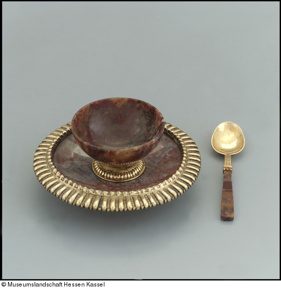 Silber, gegossen, getrieben, graviert, ziseliert, vergoldet; kalt bemalt; Achat, geschliffen, poliert; Moosachat (Holzhey), Jaspis (Werthmann); B II.203 - Achat aus der Region Freisen |