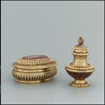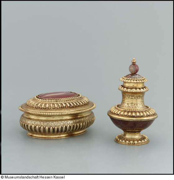 Silber, gegossen, getrieben, graviert, ziseliert, vergoldet; kalt bemalt; Achat, geschliffen, poliert, wahrscheinlich Wegeler Achat, Idar-Oberstein (Hinweis Hr. Holzhey) |
