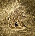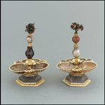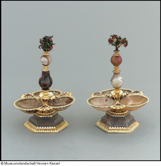 Silber, gegossen, getrieben, graviert, ziseliert, vergoldet; kalt bemalt; Achat, geschliffen, poliert, wahrscheinlich Region Freisen, südlich von Idar-Oberstein (Hinweis Hr. Holzhey) |