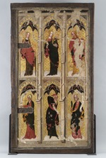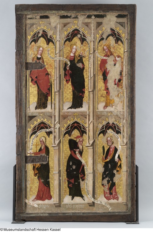 Das Altarfragment diente ursprünglich als innerer von zwei Seitenflügeln eines Doppelflügelaltars, der aus einem Mittelschrein und je zwei Seitenflügeln bestand. Auf der relativ gut erhaltenen früheren Außenseite sind sechs Heilige und Propheten dargestellt, die durch Inschriften zu ihren Füßen sowie durch Attribute wie folgt identifiziert werden können: im oberen Register die hl. Katharina, Maria mit Kind, sowie Johannes der Täufer; unten der hl. Philippus, der Prophet Joel sowie der hl. Bartholomäus. Der linke Rand der Tafel wurde beschnitten, so dass dort oben noch eine vierte Heiligenfigur, vielleicht Johannes der Täufer, sowie unten noch König Salomo ergänzt werden muss.