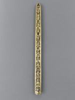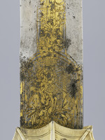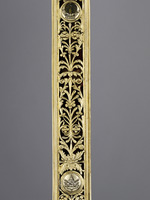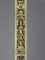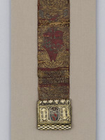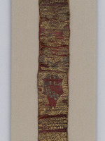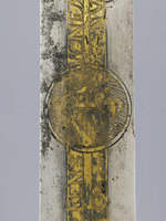 Silber, vergoldet, farbiges Email, Stahlklinge, teilvergoldet, Gürtel: Seide (Brettchenweberei?), Metallfäden - Gold- und Silberlahn, Leder |