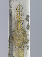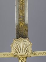 obere Zeile: INNOCEN + CIBO + GENVEN [Wappen] + PONT + MAX + ANNO + SAL + MCCCL [Imprese] XXXX (Klingeninschrift, "Paulusseite"); untere Zeile: ECCE + GLADIVUM + ADDEFE [Wappen] NSIONEM + CHRISTIANEM + VERE + [Imprese] FIDEI (Klingeninschrift "Paulusseite"); obere Zeile: ECCE + GLADIVM + ADDEFENS [Wappen] IONEM + CHRISTIANEM + VERE + FIDEI + [Imprese] (Klingeninschrift "Petrusseite"); untere Zeile: INNOCEN + CIBO + [Wappen] GENVEN + PP + VIII + PONTIFICA + SVI + ANNO + [Imprese] + VII (Klingeninschrift "Petrusseite"); "LEAV/TE + PAS/ToVT" (Radschlagender Pfau, darunter auf dem Schriftband "LEAV/TE + PAS/ToVT" (Imprese)); Parierstange, Vorderseite: + INNOCEN * CIBO * GENVEN * [Stichblatt] * PONT * MAX * ANNO * SAL * MCCC; Parierstange, Rückseite: OCEN * CIBO GENVEN PAPA * [Stichblatt] * VIII * PONTIFICA * SVI * ANNO * VIII;