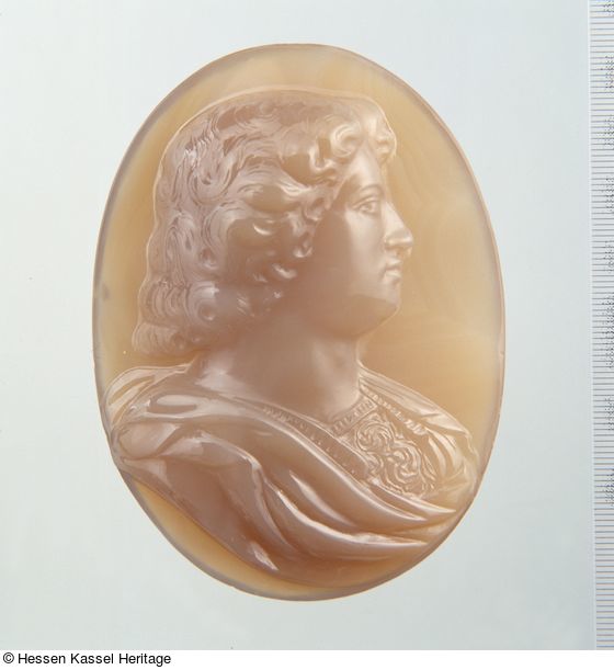 Meyer ordnet diesen sehr großflächig bearbeiteten Kameo (Meyer 1973, Nr. B-7, Taf. 8,2) der Kasseler Hofwerkstatt zu (Meyer 1973, S. 92ff.), weist jedoch darauf hin, daß der Steinschnitt nicht die typisch hessische Matt-Glanz-Technik aufweist. Die intensive und einheitliche Politur würde die differenzierte Detailausbildung in der Wirkung abschwächen.