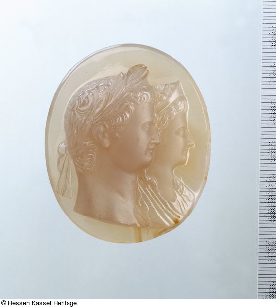 Dargestellt ist ein antikes Herrscherpaar im Staffelprofil nach rechts, der römische Kaiser vor seiner Gemahlin, in relativ hohem Relief. Diese Kamee ist, wie bereits Völkel im Steininventar von 1791 feststellte, eine Kopie nach einem antiken Capita-iugata-Kameo des Tiberius mit Lorbeerkranz und der Livia mit Stephane und Mohnkranz.