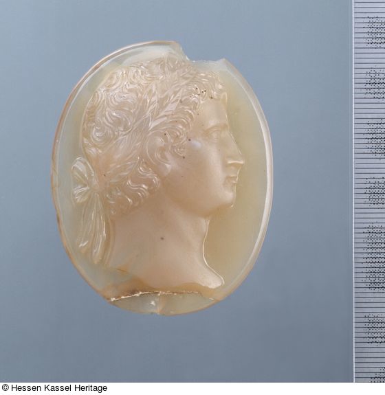 Der im Profil nach rechts dargestellte jugendliche Mann trägt einen Lorbeerkranz mit Binde, die durch eine Schleife im Nacken gehalten wird. Das Inkarnat ist matt, die übrigen Teile sind poliert. Diese Kamee darf durch ihre charakteristische Matt-Glanz-Technik stilistisch der höfischen Steinschneidewerkstatt des Landgrafen Karl zugeschrieben und ans Ende des 17. Jahrhunderts datiert werden. Sie könnte ähnlich wie B XVI. Tab. B-I-11 als Antikenkopie von Christoph Labhart oder seiner Werkstatt geschaffen worden sein.