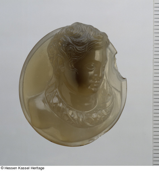 Meyers Lokalisierung nach Kassel ist in Frage zu stellen, da verschiedene Kriterien dagegensprechen. Die stark skulptural wirkende Kamee weist zwar eine ähnliche Chalcedonfärbung wie gesicherte hessische Kameen auf, ist jedoch einen Ton dunkler. Die übliche hessische Matt-Glanz-Technik fehlt, die Kamee ist gleichmäßig und rundum hoch poliert. Gegen eine geplante Befestigung an einer Miniaturfassade spricht eindeutig die konkav gewölbte Rückseite. Erinnert fühlt man sich bei diesem Exemplar an klassische antike Kameen der Art der Augustus-Kamee in Paris (Megow 1987, Nr. A 30).