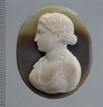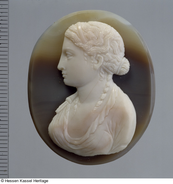 Die vorliegende Kamee zeigt ein qualitätvolles, fein ausgearbeitetes weibliches Brustbild, in Dreiviertelansicht von vorn. Kopf und Hals im Profil nach links, in dünnem, enganliegendem Gewand mit tiefem ovalem Ausschnitt mit umgeschlagenem zackenartigem Rand auf der linken Seite. Die Frisur ist kunstvoll in breite wellenartige Strähnen nach oben und hinten gezogen, darauf ein Diadem oder Stirnband. Im Nacken ein kleiner abstehender Knoten, mit einem schmalen Band gebunden. Eine lange gedrehte Locke fällt jeweils links und rechts vom Nacken zur Brust.