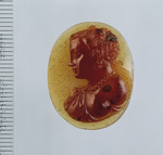 Das weibliche Brustbild im Profil nach links beeindruckt unmittelbar durch den schön gefleckten Karneol. Die linke Brust und der dazugehörige Oberarm sind entblößt, über der rechten Schulter ist ein Umhang drapiert, der durch einen Knoten mit Schleife gehalten wird. Die Haare sind in engen Wellen nach hinten gezogen. Im Ohr ein Perlengehänge, um den Hals eine auffällige Perlenkette. Im Nacken fällt ein Tuch vom Haar zum Rücken herab.