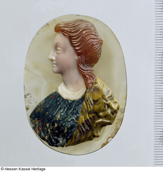 Die Halbfigur einer Frau, nach links ins Profil gewendet, könnte Diana oder Omphale darstellen. Der Stein wirkt durch seine reiche Farbigkeit. Das rosige Inkarnat und das weiße, um den Hals gefältelte schmale Tuch sind aus Chalcedon, die streifig gestalteten Haare aus rötlichem Karneol. Ein flach nach oben und unten gezogenes Haarteil am Hinterkopf ist bis auf den mittleren Ansatz verloren. Das Gewand ist aus dunklem, grün-blauem Moosachat mit rot-gelb gesprenkelten Einschlüssen, der Umhang mit dem Löwenmaskaron über der Schulter aus ockerfarbenem Jaspis. Alle Teile sind auf einer transluziden hellbeigen Chalcedonplatte in hochovaler Form befestigt.