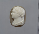 Der Gesamteindruck dieser Kamee mit einer weiblichen Darstellung leidet durch die Beschädigung der Partie zwischen Nase und Oberlippe. Der weibliche Kopf ist im Profil nach links, mit Gewandansatz, dargestellt. Die Wange wirkt gerundet und der Hals kurz und etwas stämmig. Auf das leicht gewellte Haar ist ein Diadem gesetzt, dahinter sind zwei geflochtene Zöpfe eingearbeitet. Im Nacken sind die Haare durch ein Band zusammengebunden und fallen als Zopf zum Rücken herab, das Ohr liegt frei.