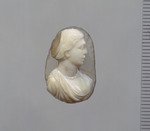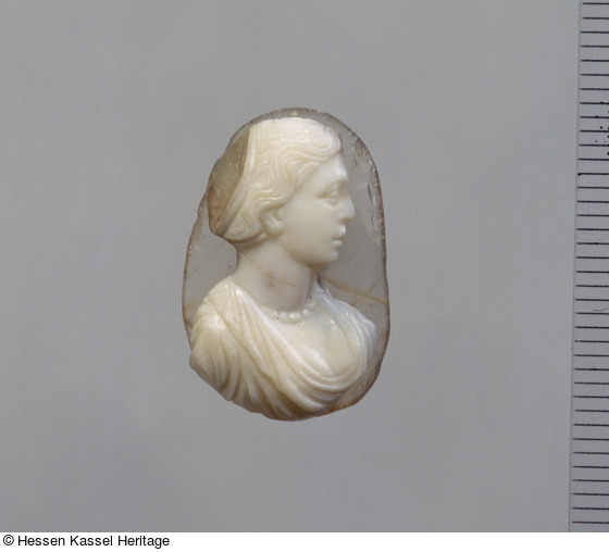 Außergewöhnlich ist hier die eigenwillige Steinverwendung und die feine Manier des Steinschnitts. Das weibliche Brustbild ist in Dreiviertelansicht dargestellt, der Kopf ins Profil nach rechts gesetzt. Das Haar liegt in lockeren Wellen und wird am Hinterkopf durch eine Haube bedeckt. Effektvoll ist die hochovale Kopfbedeckung aus der unteren transluziden Steinschicht herausgearbeitet, die hier bis in die obere Materialschicht hineinreicht. Das Gewand ist oval tief ausgeschnitten und einschließlich des breiten Randumschlags gleichmäßig gefältelt, um den Hals trägt sie eine Perlenkette. Das Gesicht ist charakterisiert durch eine kleine runde Nase und eine leicht eingezogene Mund- und Kinnpartie.