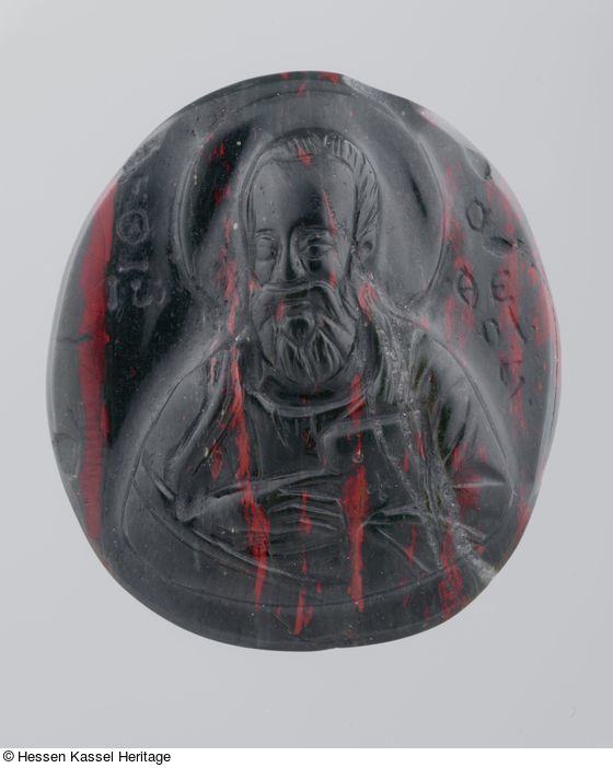 Von besonderem Interesse ist eine Heliotrop-Kamee mit Darstellung des Evangelisten Johannes, die vermutlich vor 1000 entstanden ist. Johannes mit großem Nimbus und Vollbart hält in der verhüllten Hand das Evangelium, auf das er mit seiner rechten Hand deutet. Die Figur des Heiligen wirkt merkwürdig geglättet und abgerieben, was Hans Wentzel für diese und eine weitere vergleichbare Kamee darauf zurückführte, dass sie beträchtliche Zeit „gebraucht“, also als Schmuckstück getragen worden seien. Anthony Cutler konnte am Beispiel von Elfenbeinmedaillons zeigen, wie ein solcher „Gebrauch“ in der kultischen Praxis und Privatfrömmigkeit des mittelalterlichen Byzanz ausgesehen haben könnte. Bildwerke wurden angefasst, geküsst, manchmal auch berieben oder ständig am Körper getragen, wie charakteristische Spuren an mehreren Beispielen nahelegen (Cutler 1994, S. 23-29, bes. S. 29). Auch ihre Verwendung als Talisman oder Amulett scheint denkbar. So besagt die Umschrift auf der Silberfassung einer Heliotrop-Kamee in Paris, dass dieser Stein Blutungen verhüten könne (Wentzel 1959, S. 14). Auf eine mit Jenseitsvorstellungen verknüpfte Schutzfunktion von Heliotrop-Kameen könnte der Fundzusammenhang einer heute in Münchener verwahrten Kamee mit einer Christus-Darstellung hindeuten, die deutliche Abriebspuren in dessen Gesicht aufweist: Sie wurde in einer Kirche in Slavkovica, Serbien, als Grabbeigabe in der Hand eines Skeletts entdeckt und zeigt, wie groß die Bedeutung solcher steinerner Abbilder für den Gläubigen gewesen sein muss (Kat. München 2004, S. 335). So könnten die „Gebrauchsspuren“ der Kasseler Kamee auf eine ähnlich intensive Verwendung oder Verehrung durch ihren mittelalterlichen Besitzer zurückgehen.