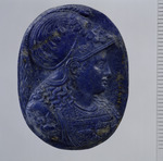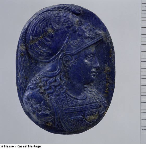 Die Vielzahl sich ähnelnder Kameen läßt auf ein Serienprodukt schließen. Der Stein und das Relief sind hier relativ dünn aus einem Stück Lapislazuli in feiner Manier geschnitten. Nahezu identische Stücke, gleichfalls aus Lapislazuli, in Venedig (Dorigato 1957, Nr. 105) und Paris (Babelon 1897, Nr. 667). Sie werden als Alexander der Große identifiziert, auf der Pariser Kamee steht die Umschrift "AΛEΞANΔPOΣ", auf der Kamee in Venedig die Devise des Herrschers "UNUS NON SUFFICIT ORBIS".