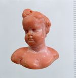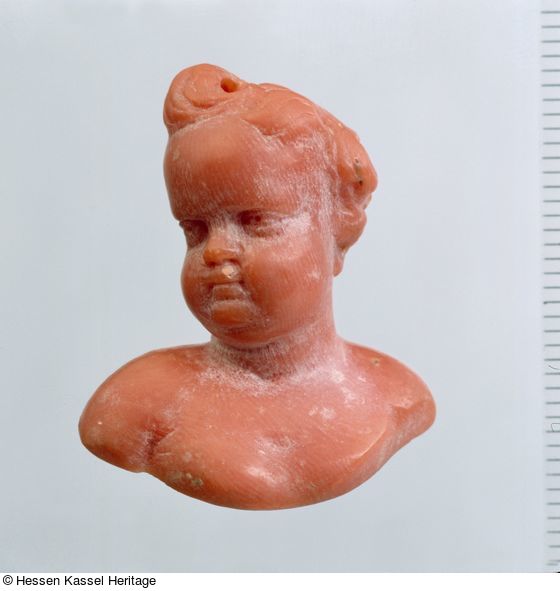 Im lockigen Haarschopf ist oben in einer Tolle eine Durchbohrung, wohl zur Aufhängung an einer Kette. Koralle wurde wegen ihrer apotropäischen Wirkung häufig als Talisman von Kindern getragen. Bereits seit der Antike wurde der Koralle Heilkraft und gleichzeitig Schutz gegen den Bösen Blick und gegen Zauberei zugeschrieben.
