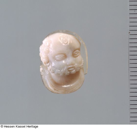 Ein verblüffendes Parallelstück in beinahe identischer Größe befindet sich in Wien im Kunsthistorischen Museum (Eichler/Kris 1927, Nr. 412). Der Gewandansatz, selbst Details wie die tuffartigen Baarthaare stimmen exakt überein, lediglich der Mund ist bei dem Wiener Stück geöffnet. Sicherlich muß von derselben Werkstatt ausgegangen werden. Möglicherweise handelt es sich hier um ein Gegenstück und beide Kameen dienten ursprünglich einem Pokal oder ähnlichem als Applikationselemente. Die starke Randbeschädigung bei dem Kasseler Kameo könnte ein Hinweis auf diese ehemalige Befestigung sein.