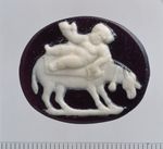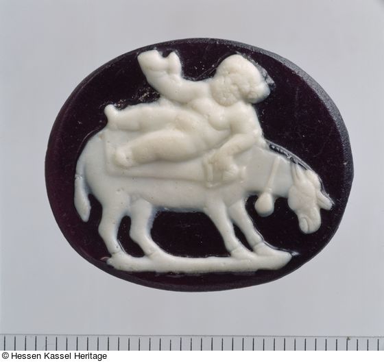 Bei dieser Glaspaste handelt es sich um ein antikisierendes Stück. Ein Silen auf einem Esel wurde in der Antike häufig dargestellt. Antike Stücke befinden sich in der Eremitage in St. Petersburg (Neverov 1971, Nr. 32; Neverov 1988, Nr. 57) und in Berlin (Furtwängler 1900, Taf. XLII, Nr. 63) in den verschiedensten Varianten. Häufig wird der Silen mit Thyrsosstab dargestellt. Bei unserem Stück hält der Silen eine Trinkschale und der Esel hat als Zutat eine Glocke um den Hals. Die Kamee zeigt insgesamt einen barocken Habitus und muß ins 17. Jahrhundert datiert werden. Bei Lippold (Lippold 1922, Taf. 112, Nr. 4) ist eine Gemme mit "Silen auf Esel in bacchischem Zug" von L. Pichler abgebildet, dort trägt der Esel gleichfalls eine Glocke um den Hals.