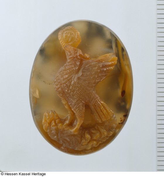 Es existiert in der Kasseler Gemmensammlung ein weiterer Phoenix-Kameo (Inv.Nr. NT 389), der im Schatzkunst-Katalog (H. Schnackenburg-Praël, in: Kat. Kassel 2001, S. 123) ausführlich besprochen wurde. Sicherlich sind beide Phoenix-Kameen nach Mailand zu lokalisieren. Der hier besprochene Kameo ist im Vergleich zu dem anderen offenbar früher entstanden. In der skulpturalen Steinbehandlung unterscheiden sich beide Stücke erheblich. Der vorliegende Phoenix-Kameo ist stark plastisch herausgearbeitet im Vergleich zu der flachen Reliefarbeit des zweiten Phoenix mit den ausgebreiteten Schwingen. Der erste Phoenix zeigt eine charakteristische Hinterschneidung, die teilweise zu freistehenden Elementen führt, wie beim Kopf und dem oberen Flügel. Die beiden Kasseler Phoenix-Kameen werden bei Weber (Weber 1992, Nr. 124) mit ausführlicher Besprechung des Phoenixtypus erwähnt.
