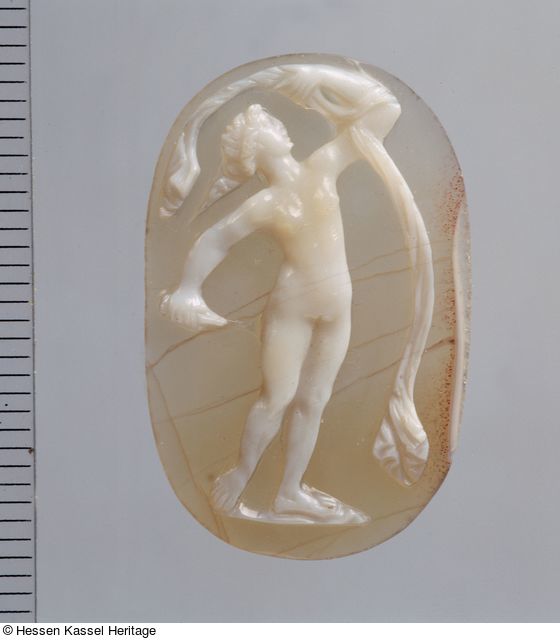 In ekstatischem Tanz bewegte nackte weibliche Figur von vorn, den Oberkörper stark zu ihrer rechten Seite gebogen und aufblickend. Über ihrem nach oben gerichteten abgewinkelten linken Arm liegt ein Schleier, der sich über die Figur wölbt und rechts weit herunterhängt. In ihrer nach unten gestreckten rechten Hand hält sie einen Dolch. Die flach gearbeitete Kamee ist insgesamt hochglänzend poliert, wodurch der aktive Ausdruck der Figur verstärkt wird.