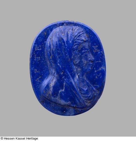 Die hier Dargestellte läßt sich aufgrund der eingeritzten Inschrift "APTE" und "MIΣI" als Artemisia identifizieren.
